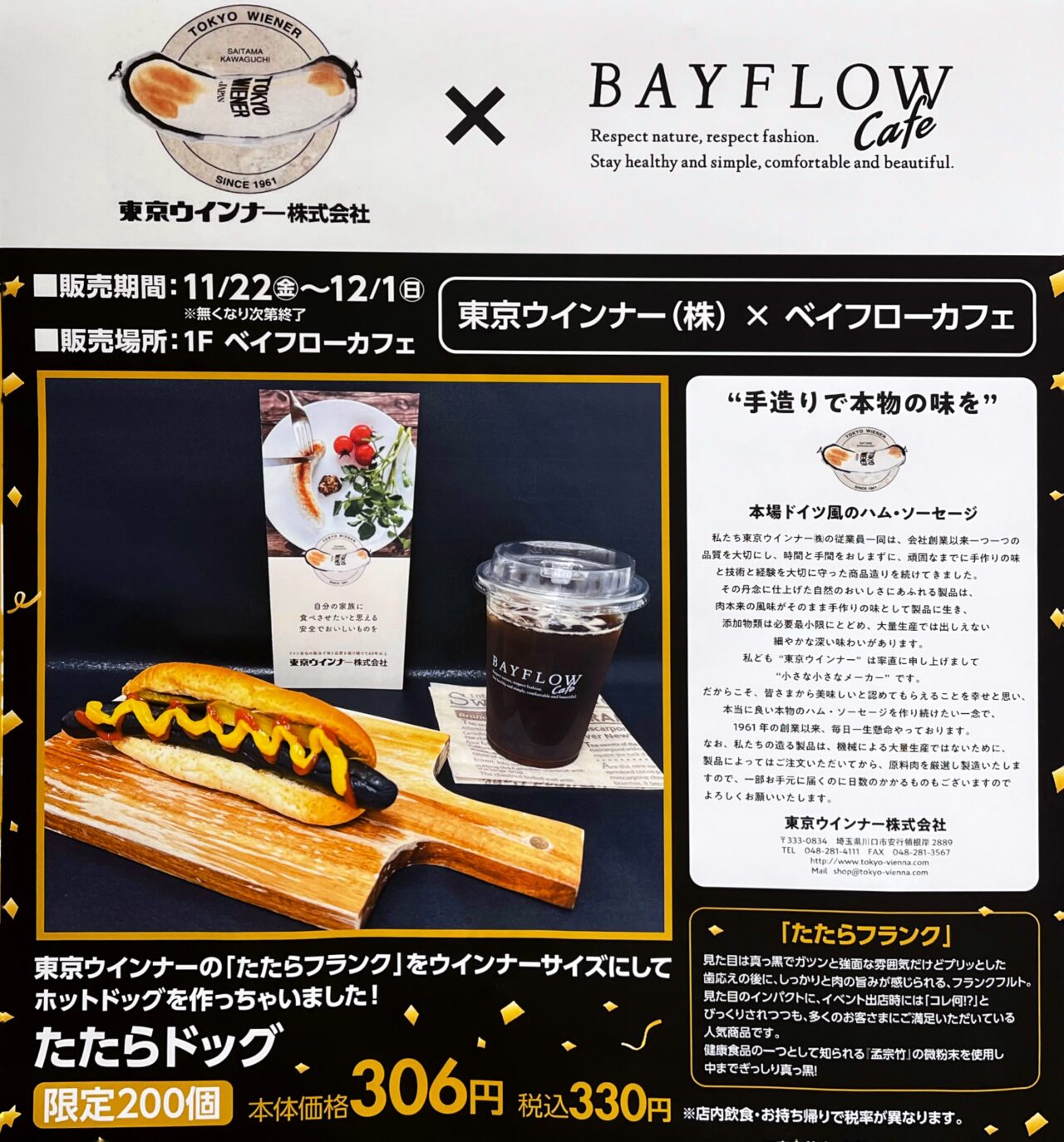【川口市】11月22日(金)からイオンモールブラックフライデーがスタート!イオンモール川口の「ベイフローカフェ」で「東京ウインナー株式会社」とコラボした限定ドッグが味わえるようです!