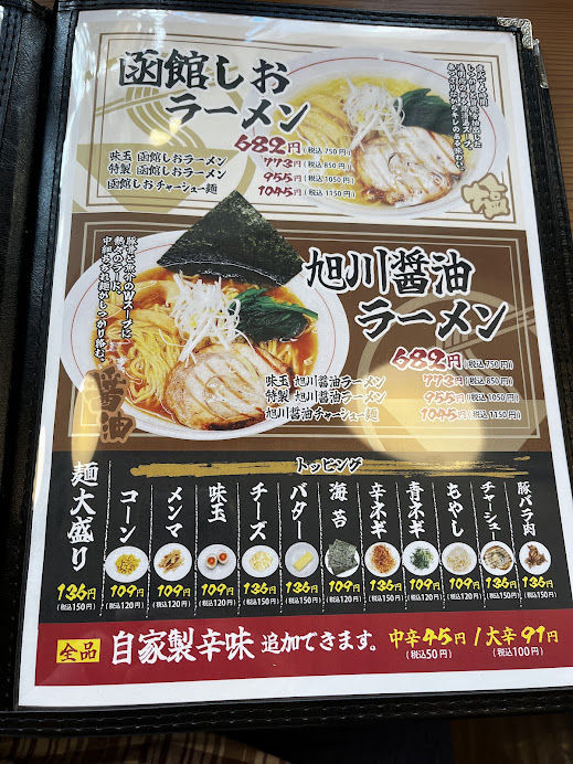 透明感のある鶏清湯スープ を使った「函館しおラーメン」や、豚骨と魚介のWスープの「旭川醤油ラーメン」もありますよ。