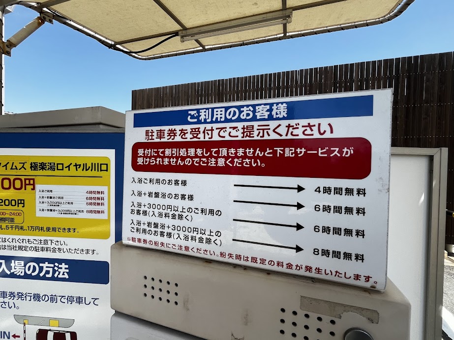 併設されている駐車場は、入浴のみの場合は4時間無料、入浴と岩盤浴を利用される方は6時間無料となっています。