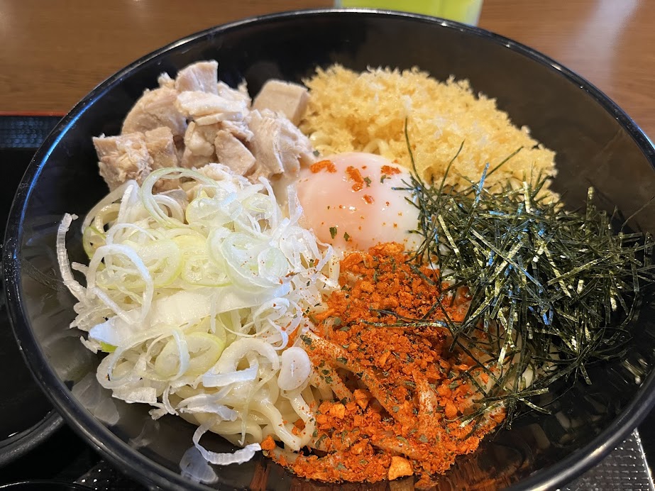 もちもちの麺には温玉、天かす、鶏肉、ネギ、のりがトッピングされていて、ザクザク食感がたまりません。