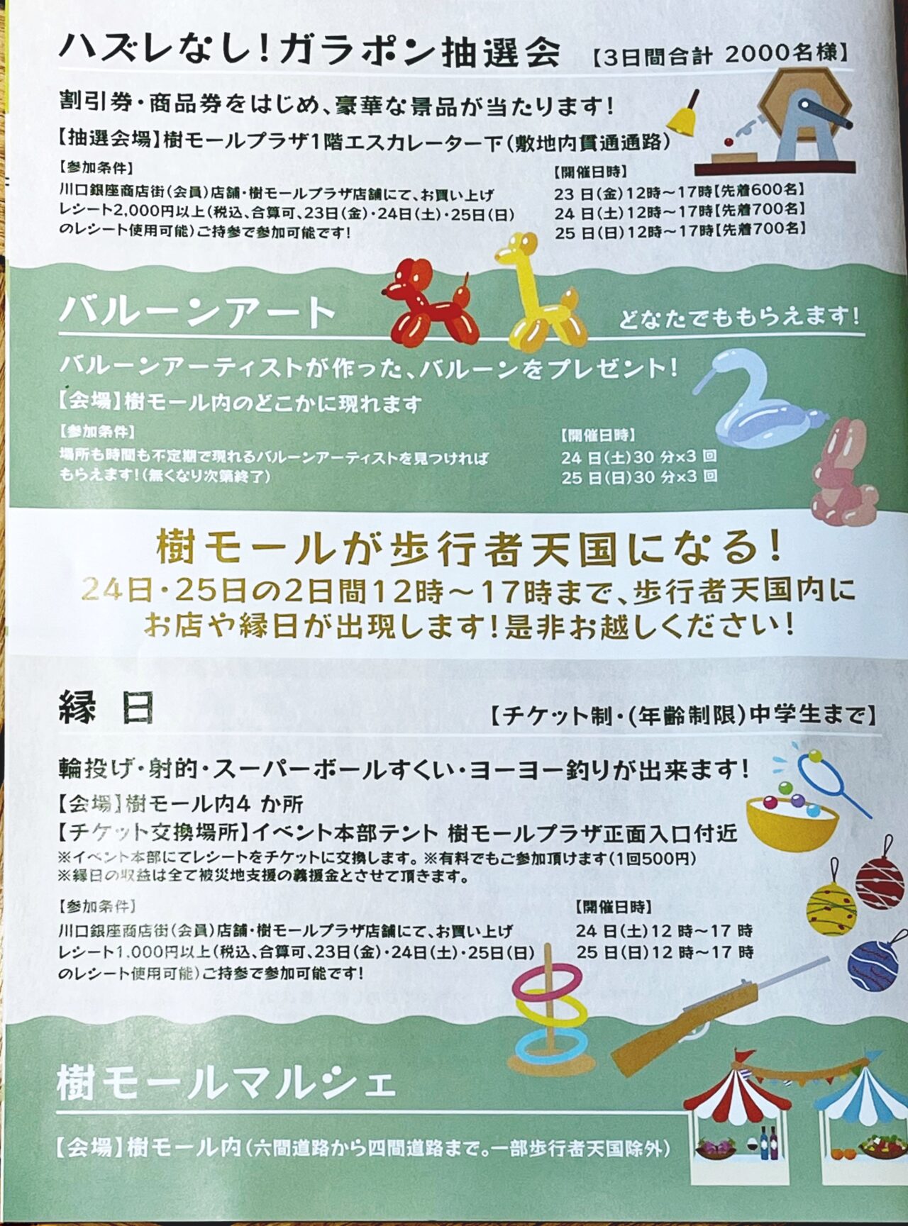他にも、5月24日(土)・25日(日)は商店街が歩行者天国になり、縁日や樹モールマルシェが開催されますよ!