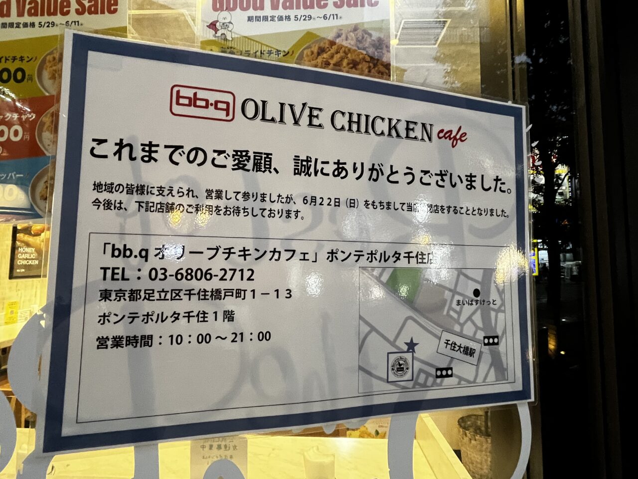 【川口市】樹モールプラザ内にある「bb.qオリーブチキンカフェ」が6月22日(日)をもって閉店するそうです。