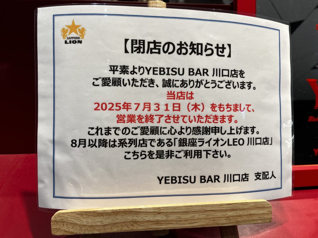 【川口市】樹モールプラザ内にある「YEBISU BAR 樹モールプラザ川口店」が7月31日(木)をもって閉店するそうです。