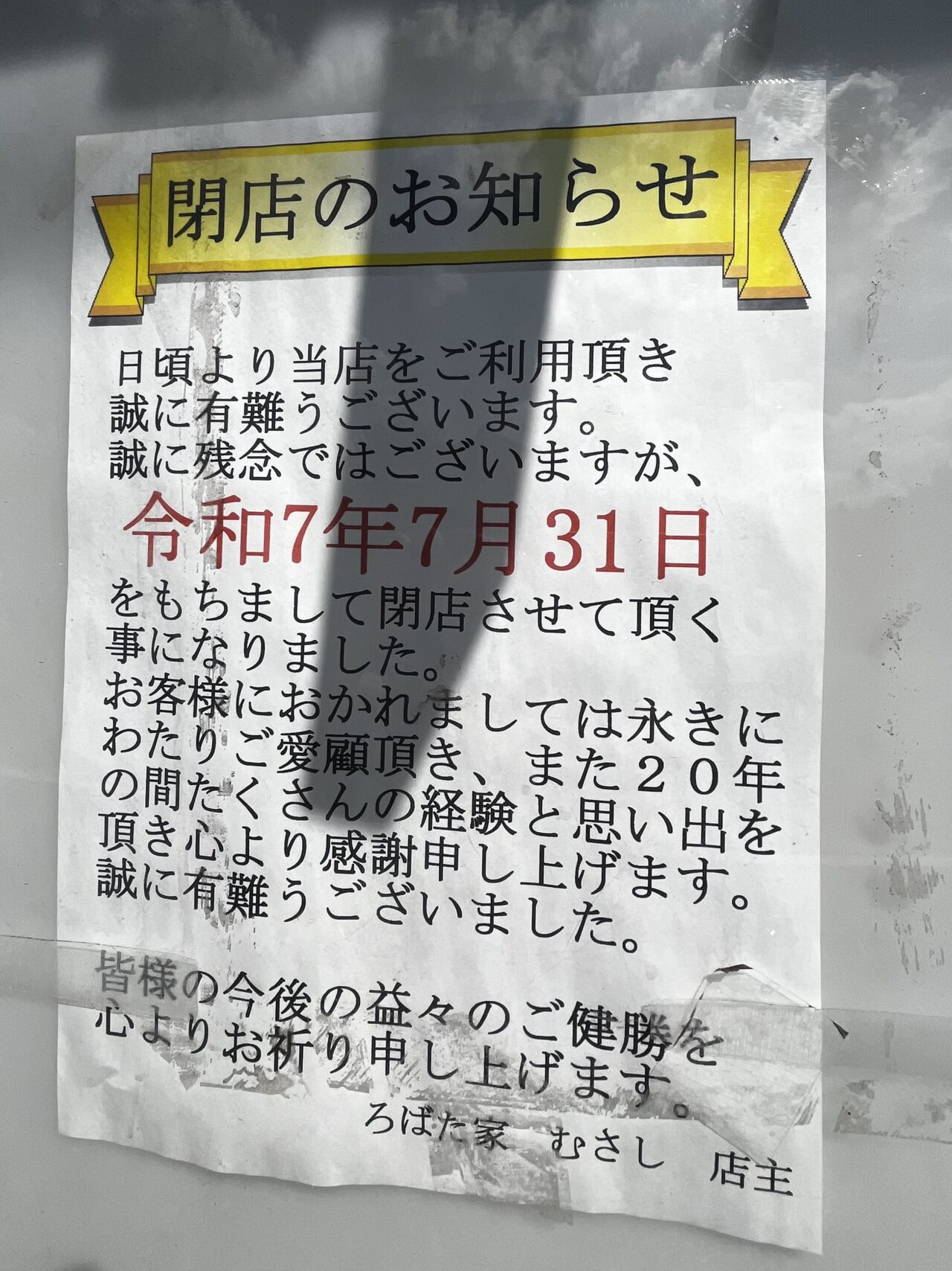 安行領根岸にある居酒屋「ろばた家むさし 川口店」が、2025年7月31日(木)をもって閉店するそうです。