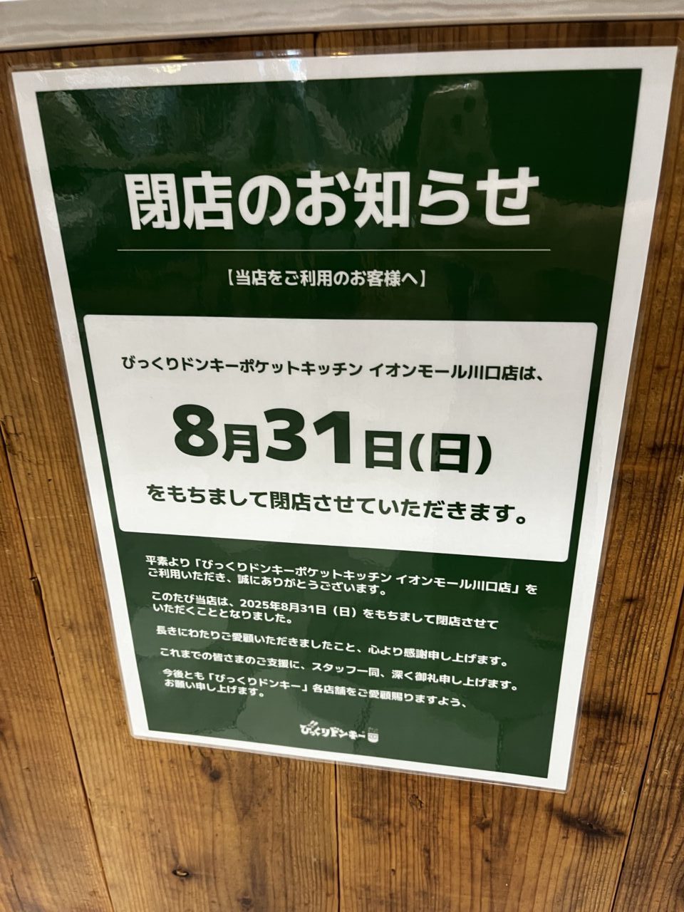 その中にある「びっくりドンキーポケットキッチン イオンモール川口店」が2025年8月31日(日)で閉店するそうです。