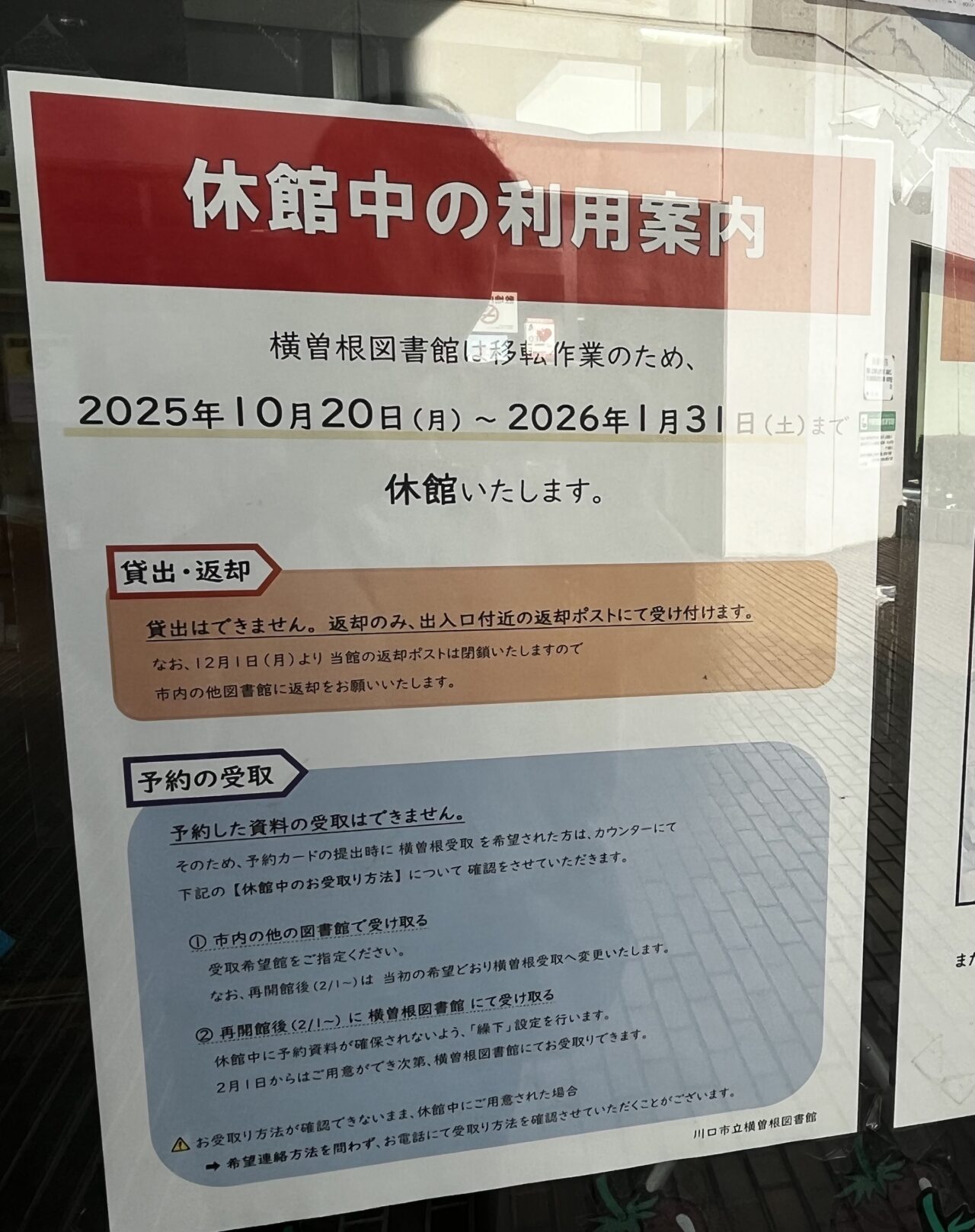 また、横曽根図書館は移転作業のため2025年10月20日(月)から2026年1月31日(土)まで休館となるそうです。