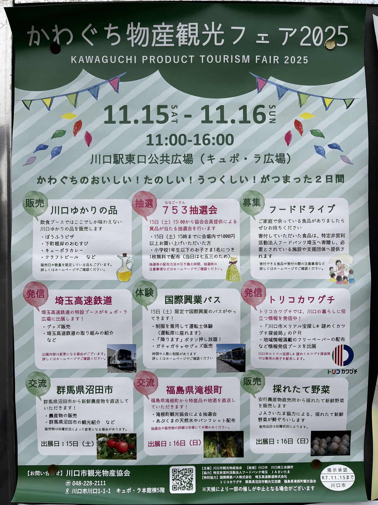 【川口市】川口の魅力が勢揃い!11月15日・16日(日)に「かわぐち物産観光フェア2025」がキュポ・ラ広場で開催されるようです!