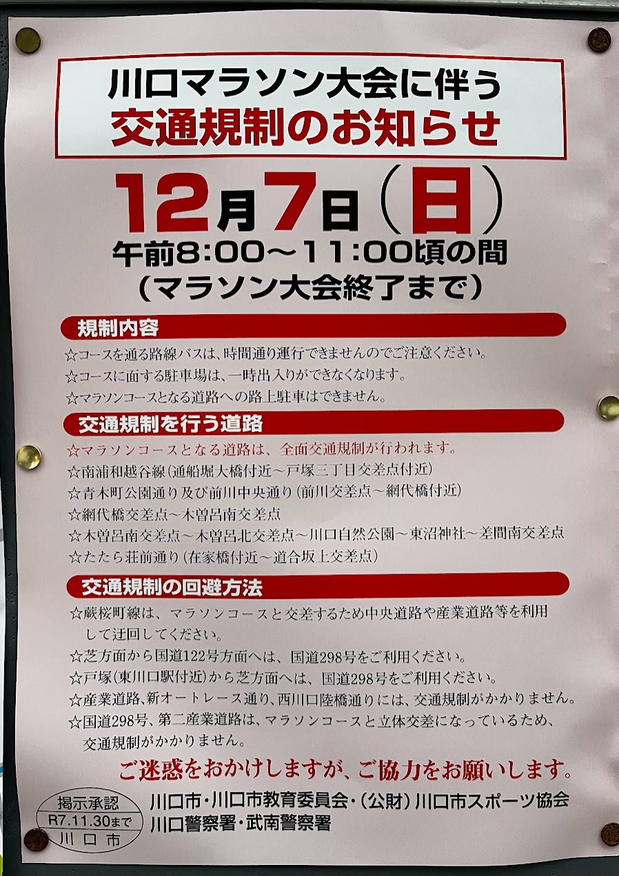 【川口市】交通規制にご注意ください!12月7日(日)に川口マラソン大会が開催されます!