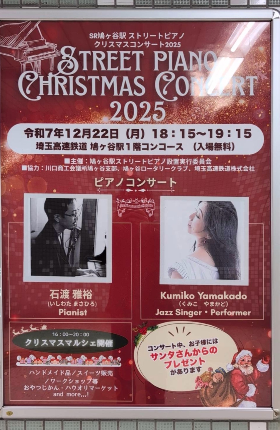 【川口市】鳩ヶ谷駅1階コンコースにて「ストリートピアノクリスマスコンサート2025」が12月22日(月)に開催されるそうです!
