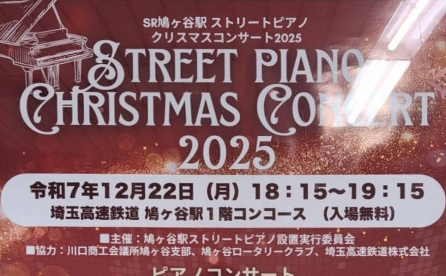 2025年12月22日(月)、埼玉高速鉄道鳩ヶ谷駅1階コンコースにて「ストリートピアノクリスマスコンサート2025」が開催されます。