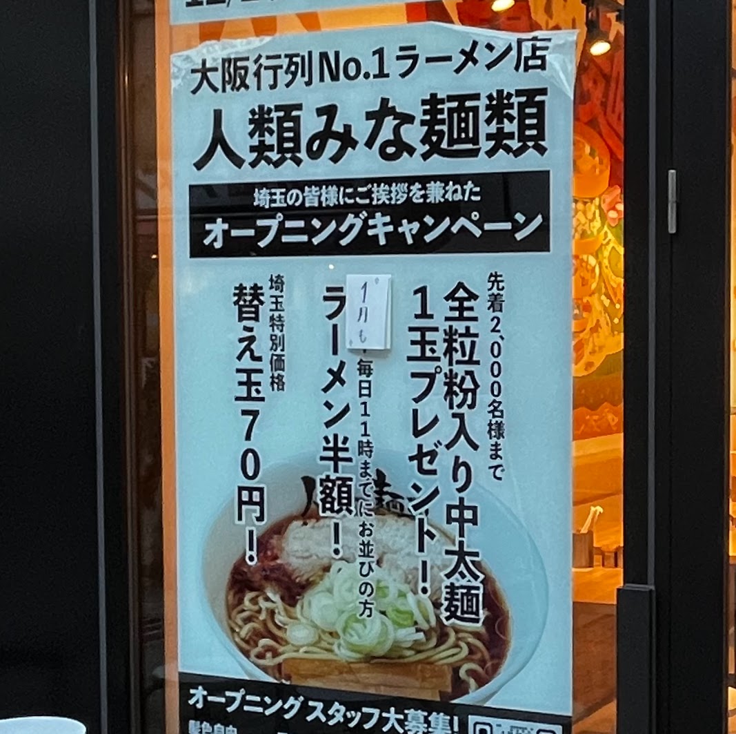 「人類みな麺類」は、大阪を拠点に展開するラーメン店で、埼玉県への出店ははじめてとのことです。