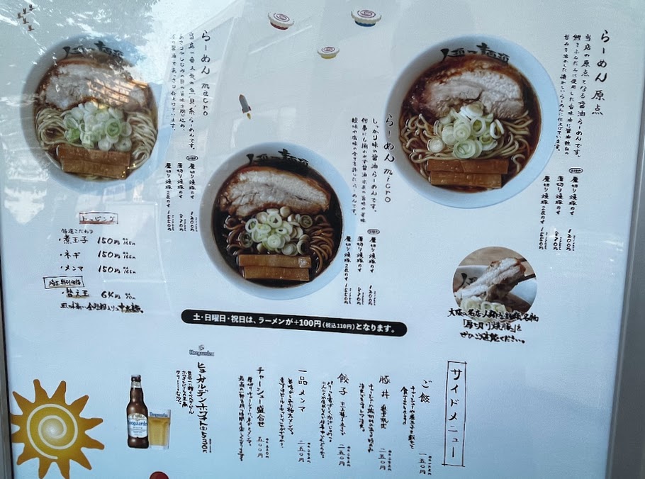 ラーメンのメニューは、鰹をふんだんに使用した香味油が特徴の醤油ラーメン「らーめん 原点」、しっかり味の黒いスープがインパクト大の醤油ラーメン「らーめんmicro」、魚「貝」系の薄口醤油ラーメン「らーめんmacro」の3種類です。