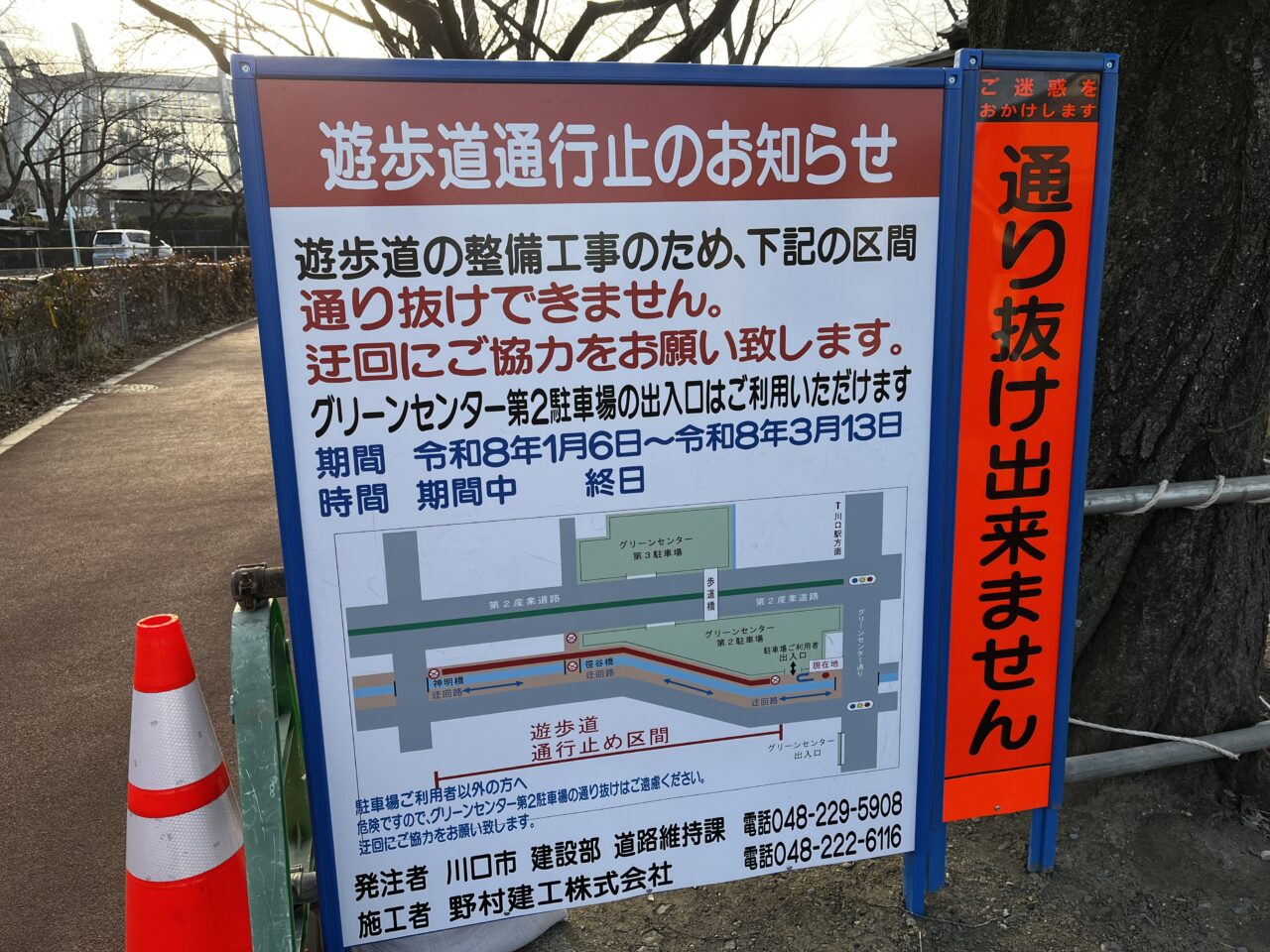 【川口市】お散歩の際はご注意を!見沼遊歩道の一部が3月13日まで通行止めになっていました。