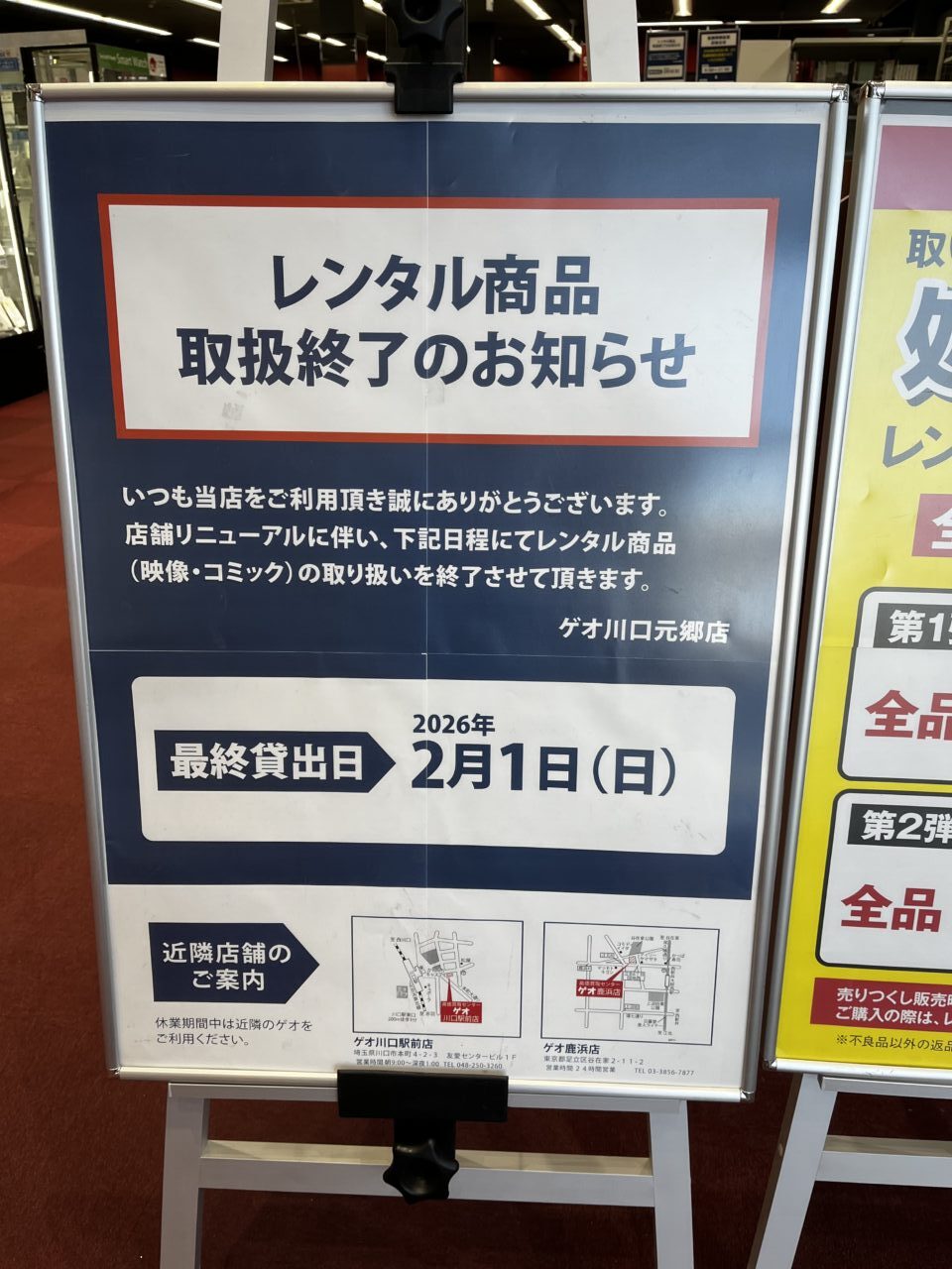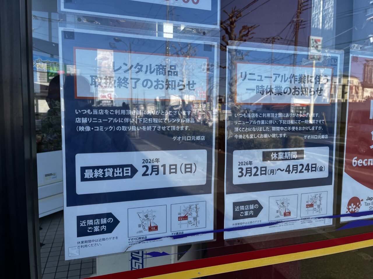 【川口市】「ゲオ川口元郷店」が大規模改装へ!2月2日より営業時間が変わり、3月2日から長期休店されるそうです。