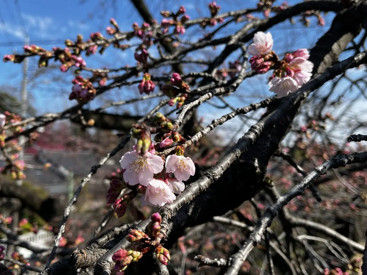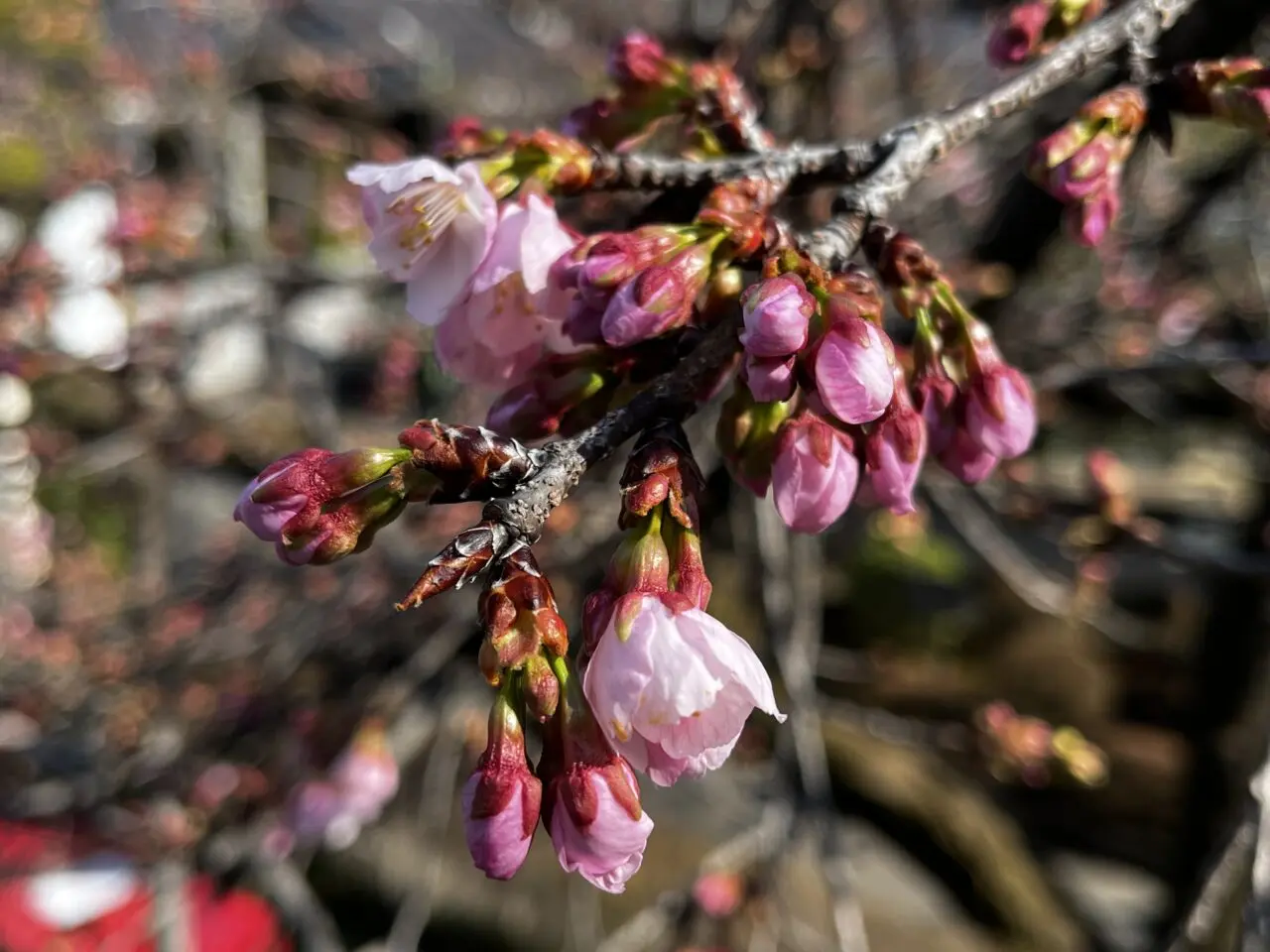 まだ開いている桜は多くはありませんが、つぼみは色づき、大きくなり、開いている花もちらほらありました。
