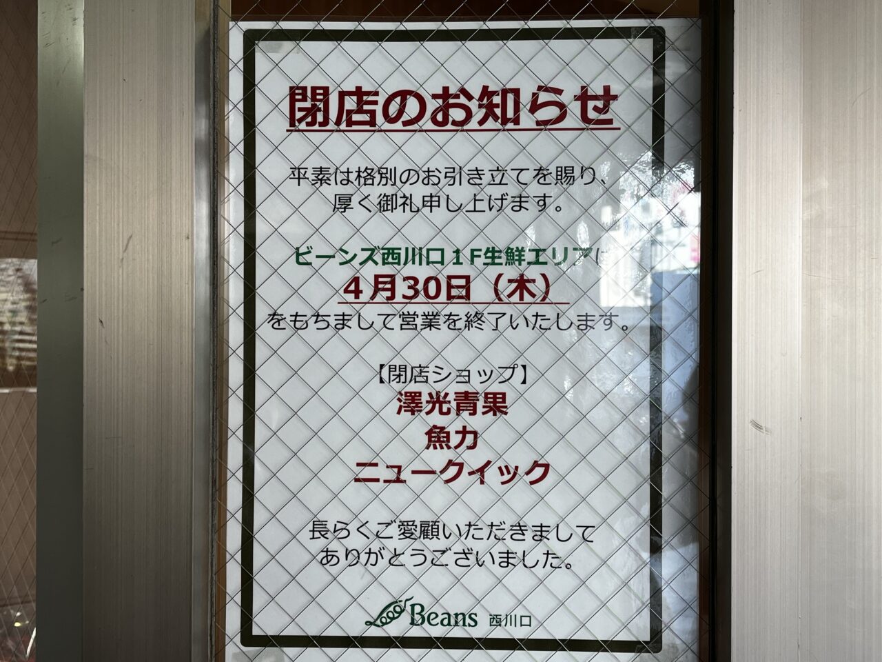 【川口市】ショック…西川口駅直結「ビーンズ西川口」の生鮮エリア3店舗が4月30日をもって閉店へ。