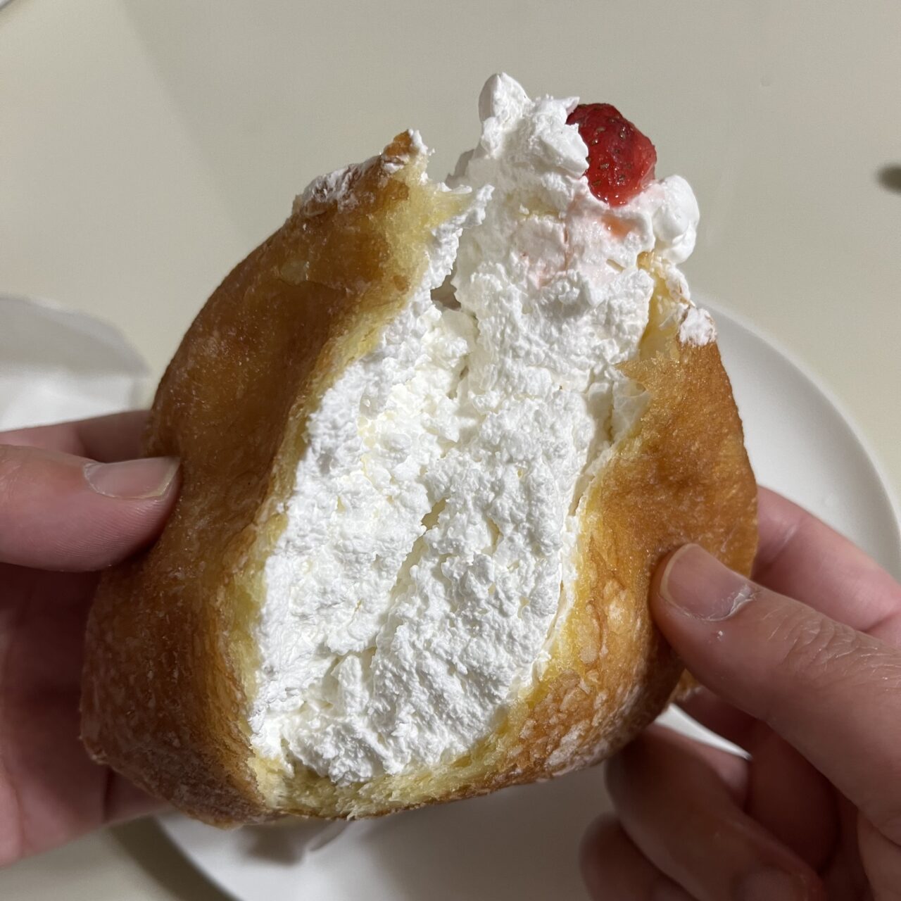 「生いちごのミルクドーナツ」の中にはたっぷりのクリームが詰まっており、持った瞬間にずっしりとした重みを感じるほど贅沢な仕上がりです。