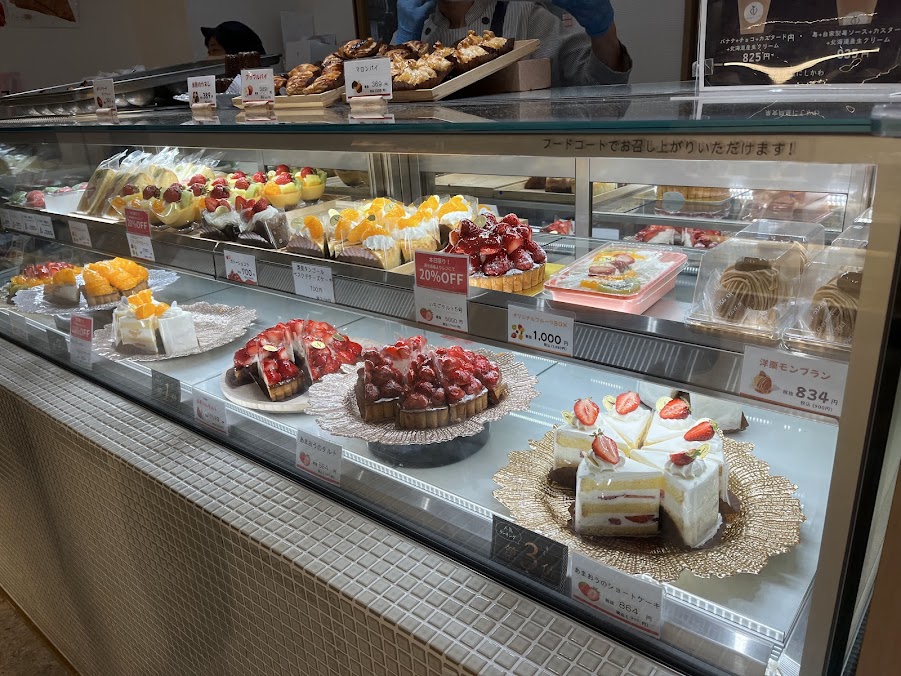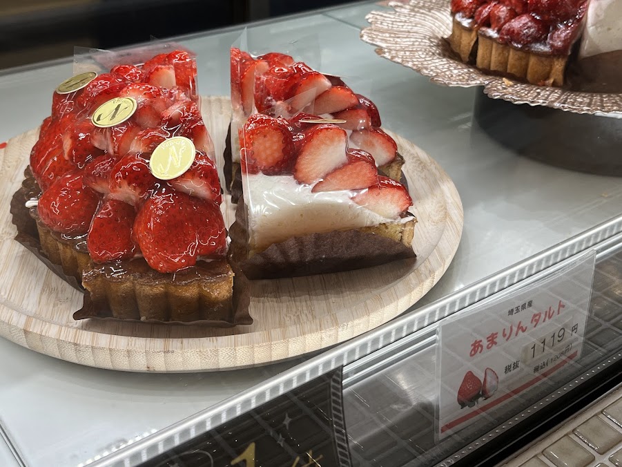 ショーケースには埼玉県産のいちご「あまりん」をふんだんに使ったタルトなど、色鮮やかな商品が並んでいます。