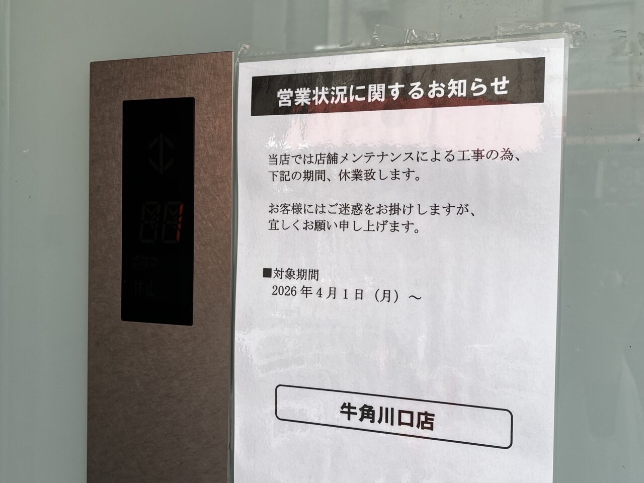 ビルの入り口に掲示されていた案内によると、2026年4月1日(水)から店舗メンテナンスによる工事のため、一時休業となっています。