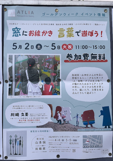 2026年5月2日(土)から5月5日(火・祝)の期間中、川口市立アートギャラリー・アトリア20周年記念事業「彫刻家 山本信 回顧展 〜小4から84歳まで〜」関連イベント「窓にお絵かき 言葉で遊ぼう!」が開催されます。